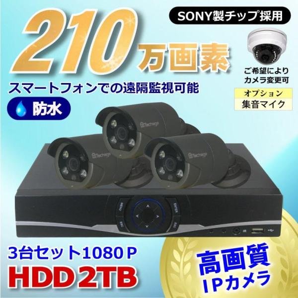 防犯カメラ 210万画素 4CH NVRレコーダーSONY製 PoE IPカメラ3台セット (LAN接続)HDD2TB 1080P フルHD 高画質 監視カメラ 屋外 屋内 赤外線 夜間撮影 3.6mm