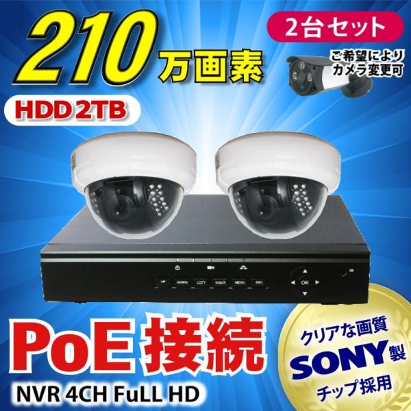 防犯カメラ 210万画素 4CH POEレコーダーSONY製 ドーム型 IPカメラ2台セット (LAN接続)HDD 2TB 1080P フルHD 高画質 監視カメラ 屋内 赤外線 夜間撮影