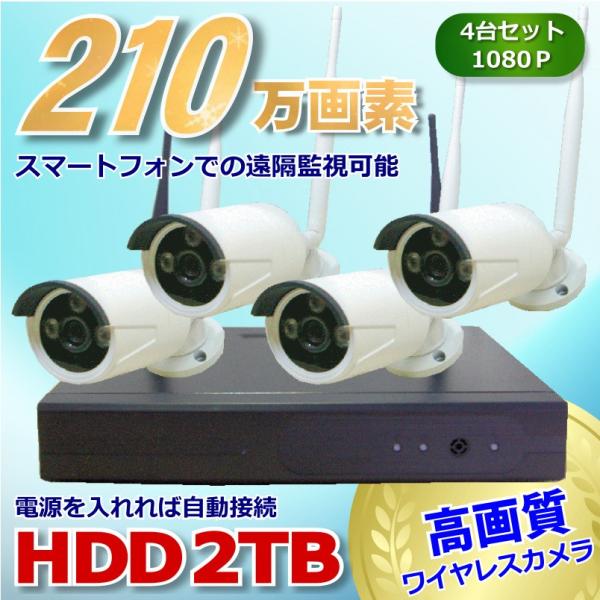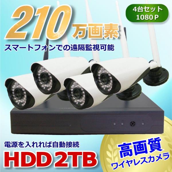 防犯カメラ 監視カメラ4台セット ワイヤレス 210万画素 HDD 2TB 4ch レコーダー HDハイビジョン 無線 1080P 屋外 屋内 スマホ 録画機能付き