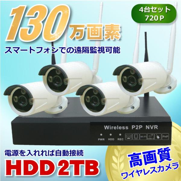 防犯カメラ 監視カメラ4台セット ワイヤレス 130万画素 HDD 2TB 4ch レコーダー HDハイビジョン 無線 720P 屋外 屋内 スマホ 録画機能付き