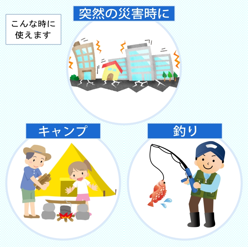 飲み水がない場合は、池の水や、雨水をこれで浄水すれば、飲料可能に