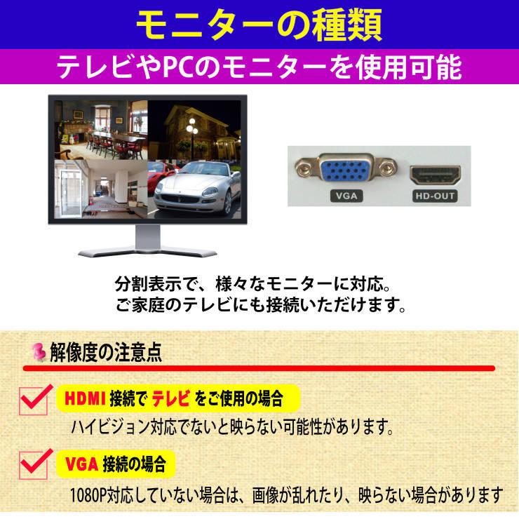 テレビを監視用モニターとして使用する場合は、ハイビジョン対応のTVでないと映らない事があります、その場合はPC用のモニターをお使いください
