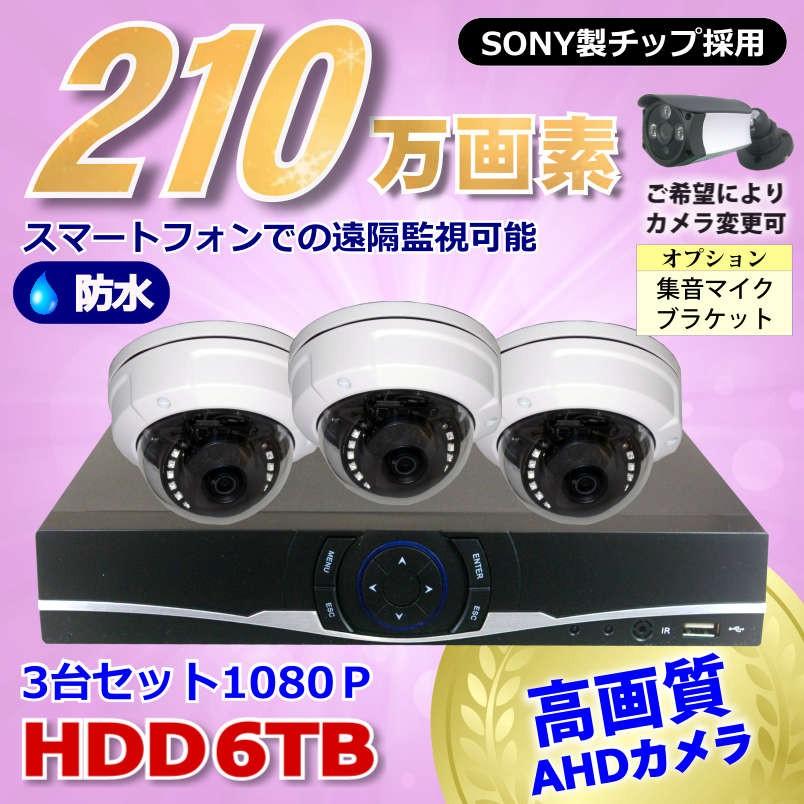 防犯カメラ 210万画素 4CH DVR レコーダー SONY 防水 ドームカメラ 3台 セット HDD 6TB 音声入力 AHD 1080P フルHD 高画質 録画屋外 屋内 赤外線 夜間撮影