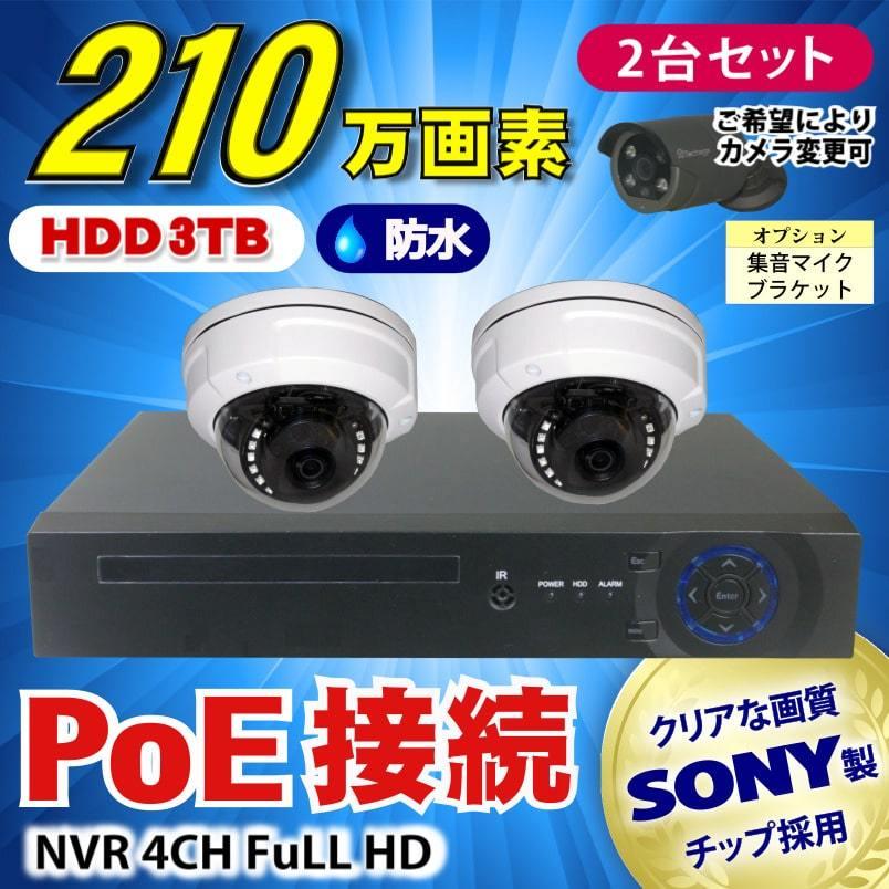 防犯カメラ 210万画素 4CH POEレコーダーSONY製IPカメラ2台セット (LAN接続)HDD 3TB 1080P フルHD 高画質 監視カメラ 屋外 屋内 赤外線 夜間撮影 3.6mmレンズ