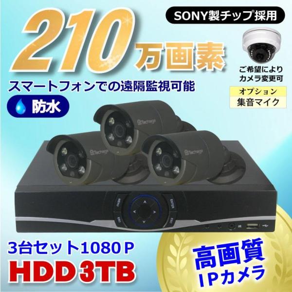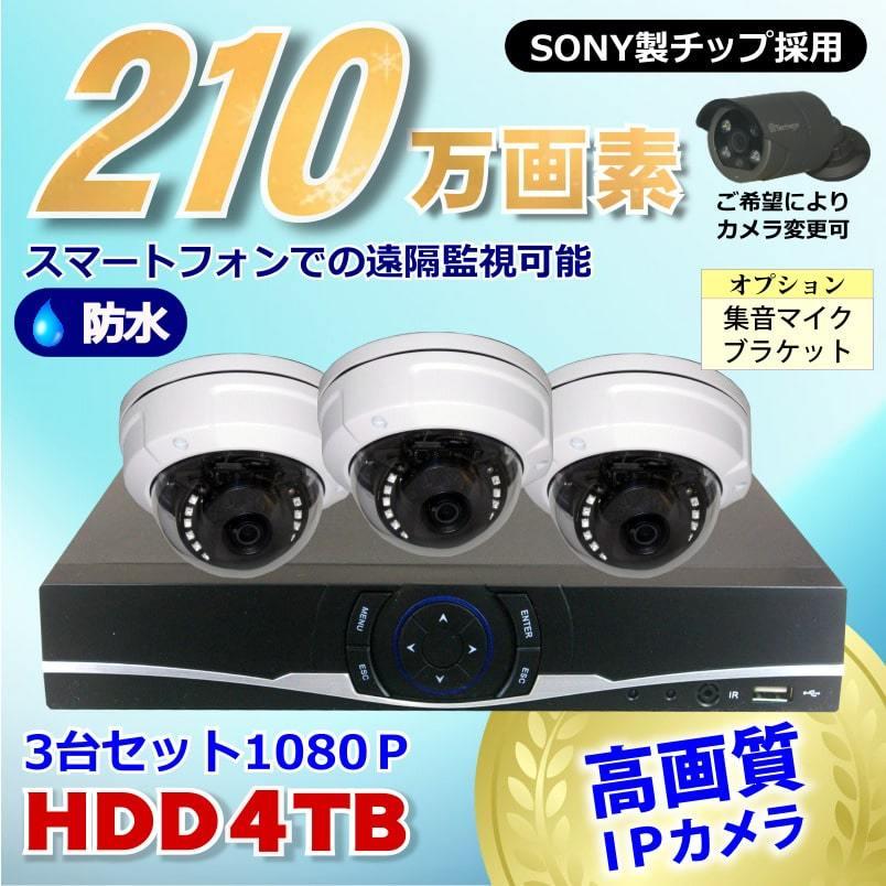 防犯カメラ 210万画素 4CH NVR レコーダー SONY製 防水 ドーム型 IPカメラ 3台 セット 音声入力 LAN接続 HDD3TB 1080P 監視カメラ ネットワーク 夜間撮影