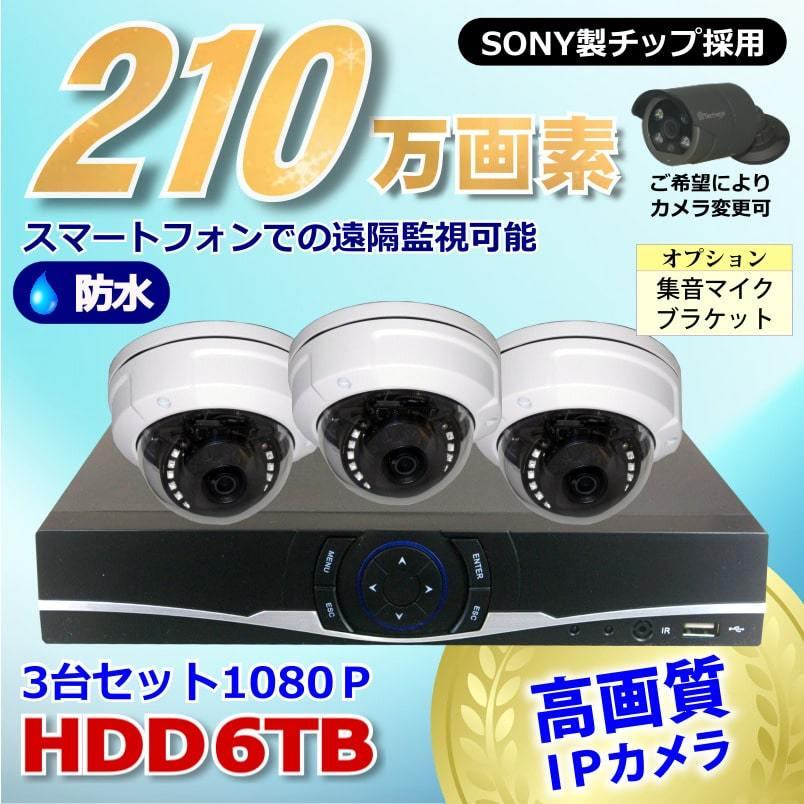 防犯カメラ 210万画素 4CH NVR レコーダー SONY製 防水 ドーム型 IPカメラ 3台 セット 音声入力 LAN接続 HDD6TB 1080P 監視カメラ ネットワーク 夜間撮影