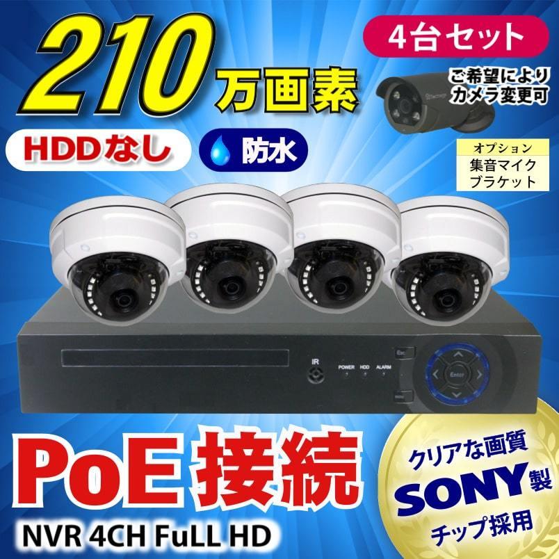 防犯カメラ 210万画素 4CH POE レコーダー SONY製 防水 ドーム型 IPカメラ 4台 セット 音声録音 HDD なし LAN接続 1080P 高画質 監視カメラ 赤外線 夜間撮影
