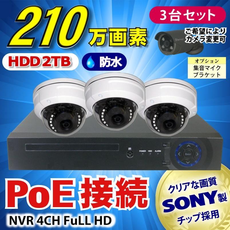 防犯カメラ 210万画素 4CH POE レコーダー SONY製 防水 ドーム型 IPカメラ 3台 セット 音声録音 HDD 2TB LAN接続 1080P 高画質 監視カメラ 赤外線 夜間撮影