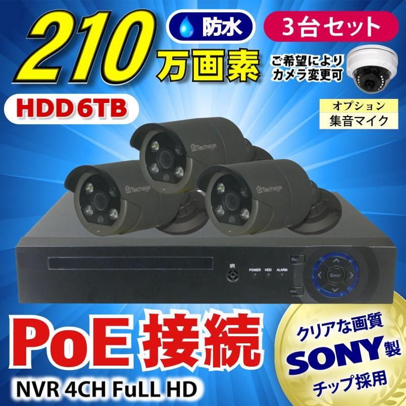 防犯カメラ 210万画素 4CH POE レコーダー SONY製 IP カメラ 3台セット (LAN接続)HDD 6TB 1080P フルHD 高画質 監視カメラ 屋外 屋内 赤外線 夜間撮影