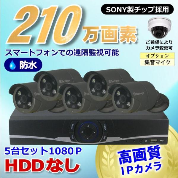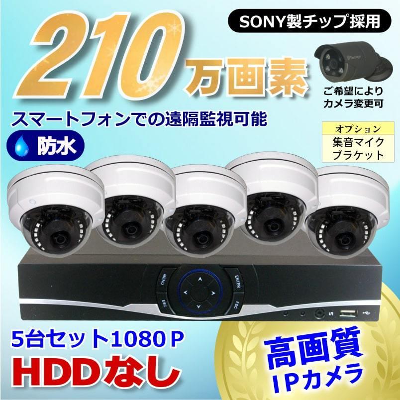 防犯カメラ 210万画素 8CH NVR レコーダー SONY製 防水 ドーム型 IPカメラ 5台 セット 音声入力 LAN接続 HDDなし 1080P 監視カメラ ネットワーク 夜間撮影
