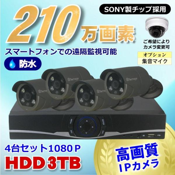 防犯カメラ 210万画素 4CH NVR レコーダー SONY製 防水 ドーム型 IPカメラ 4台 セット 音声入力 LAN接続 HDD3TB 1080P 監視カメラ ネットワーク 夜間撮影