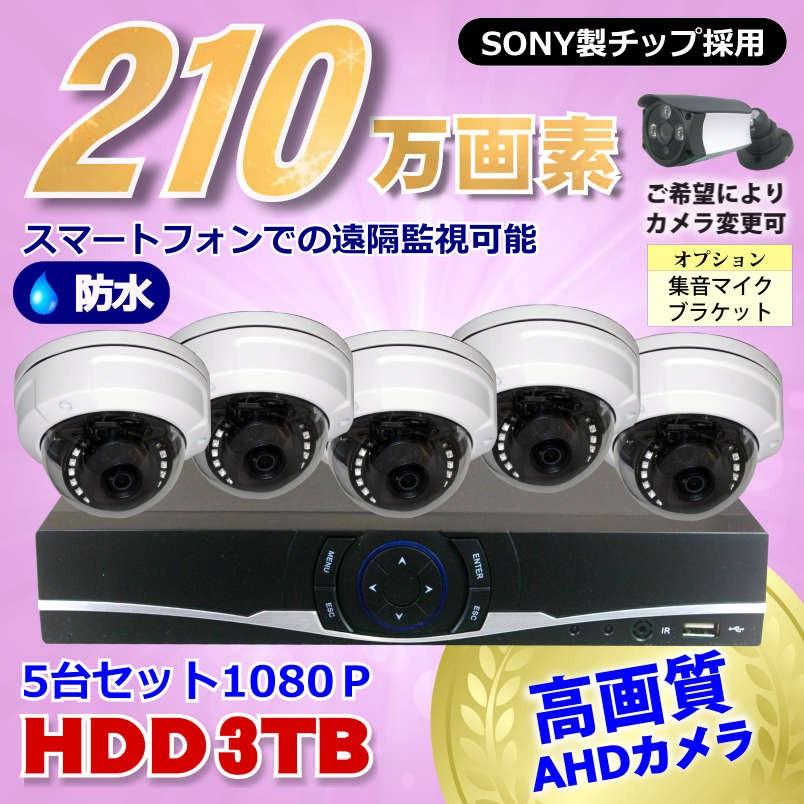 防犯カメラ 210万画素 8CH DVR レコーダー SONY 防水 ドームカメラ 5台 セット HDD 3TB 音声入力 AHD 1080P フルHD 高画質 録画屋外 屋内 赤外線 夜間撮影