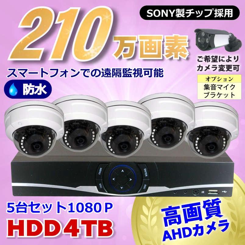 防犯カメラ 210万画素 8CH DVR レコーダー SONY 防水 ドームカメラ 5台 セット HDD 4TB 音声入力 AHD 1080P フルHD 高画質 録画屋外 屋内 赤外線 夜間撮影