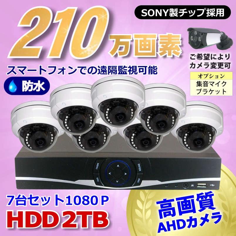 防犯カメラ 210万画素 8CH DVR レコーダー SONY 防水 ドームカメラ 7台 セット HDD 2TB 音声入力 AHD 1080P フルHD 高画質 録画屋外 屋内 赤外線 夜間撮影