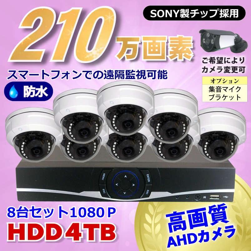 防犯カメラ 210万画素 8CH DVR レコーダー SONY 防水 ドームカメラ 8台 セット HDD 4TB 音声入力 AHD 1080P フルHD 高画質 録画屋外 屋内 赤外線 夜間撮影