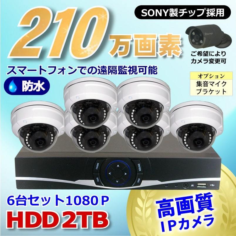 防犯カメラ 210万画素 8CH NVR レコーダー SONY製 防水 ドーム型 IPカメラ 6台 セット 音声入力 LAN接続 HDD2TB 1080P 監視カメラ ネットワーク 夜間撮影