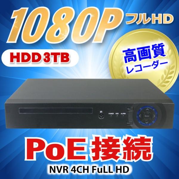 防犯カメラ用 NVR PoE 4CHレコーダー HDD-3TB フルハイビジョン対応 1080P LAN接続 フルHD 高画質 210万画素 監視カメラ 屋外 屋内 赤外線 夜間撮影